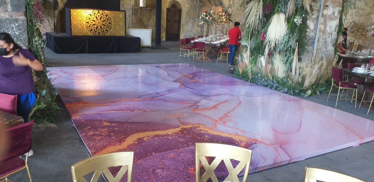 PISTAS que son forradas con material llamado selloplast, en este material se pueden imprimir texturas y cualquier diseño que tenga imagenes complejas, por su versatilidad es la opción mas recurrida para la decoración de pistas de boda.